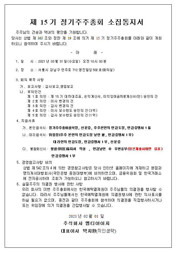 2021년 제 15기 정기주주총회 안내드립니다.
