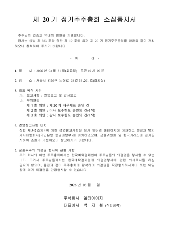 2026년 제20기 정기주주총회 안내 드립니다.